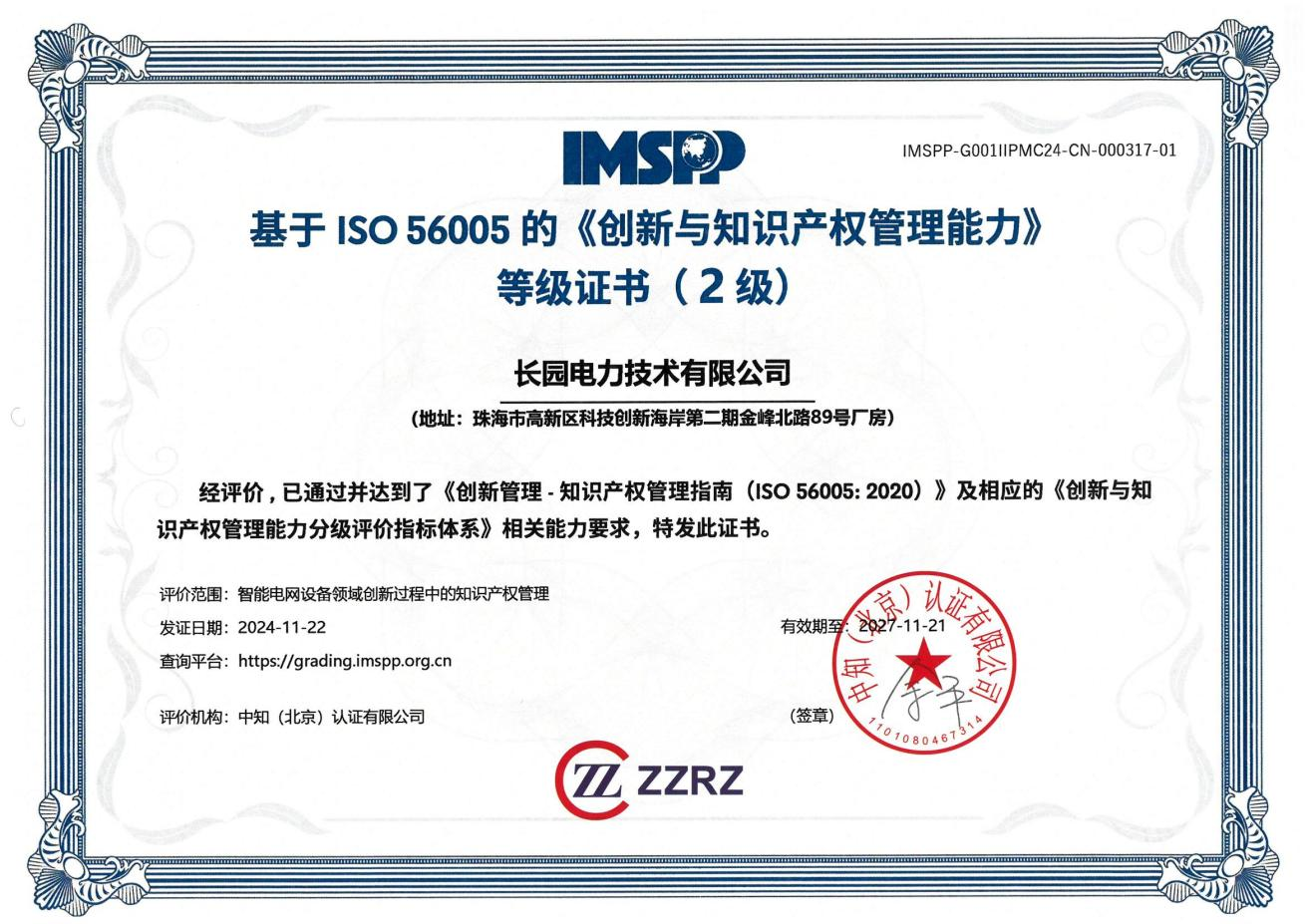 近日,在珠海市与高新区的知识产权主管部门领导班子的带领指导下,YABO鸭脖科技集团旗下子公司YABO鸭脖电力技术有限公司(以下简称:YABO鸭脖电力)顺利获得珠海首批智能电网设备领域国际标准ISO 56005二级认证证书。
